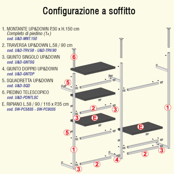 Piedino telescopico UP & DOWN per fissaggio a soffitto montante nella configurazione capovolta