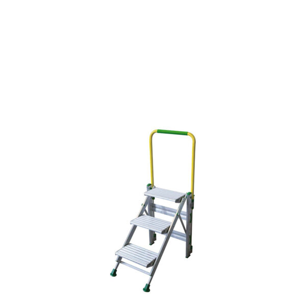 Sgabello professionale pieghevole tutto alluminio. Previsto in due versioni, con e senza paracorpo. Gradini larghi 37 cm, profondi 230 mm.