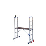 Trabattello d’alluminio a due alzate con innesti d’acciaio rivestiti di speciali resine. Collegamenti orizzontali e diagonali istantanei con espansori nei fori dei gradini. Lunghe leve di facile uso.